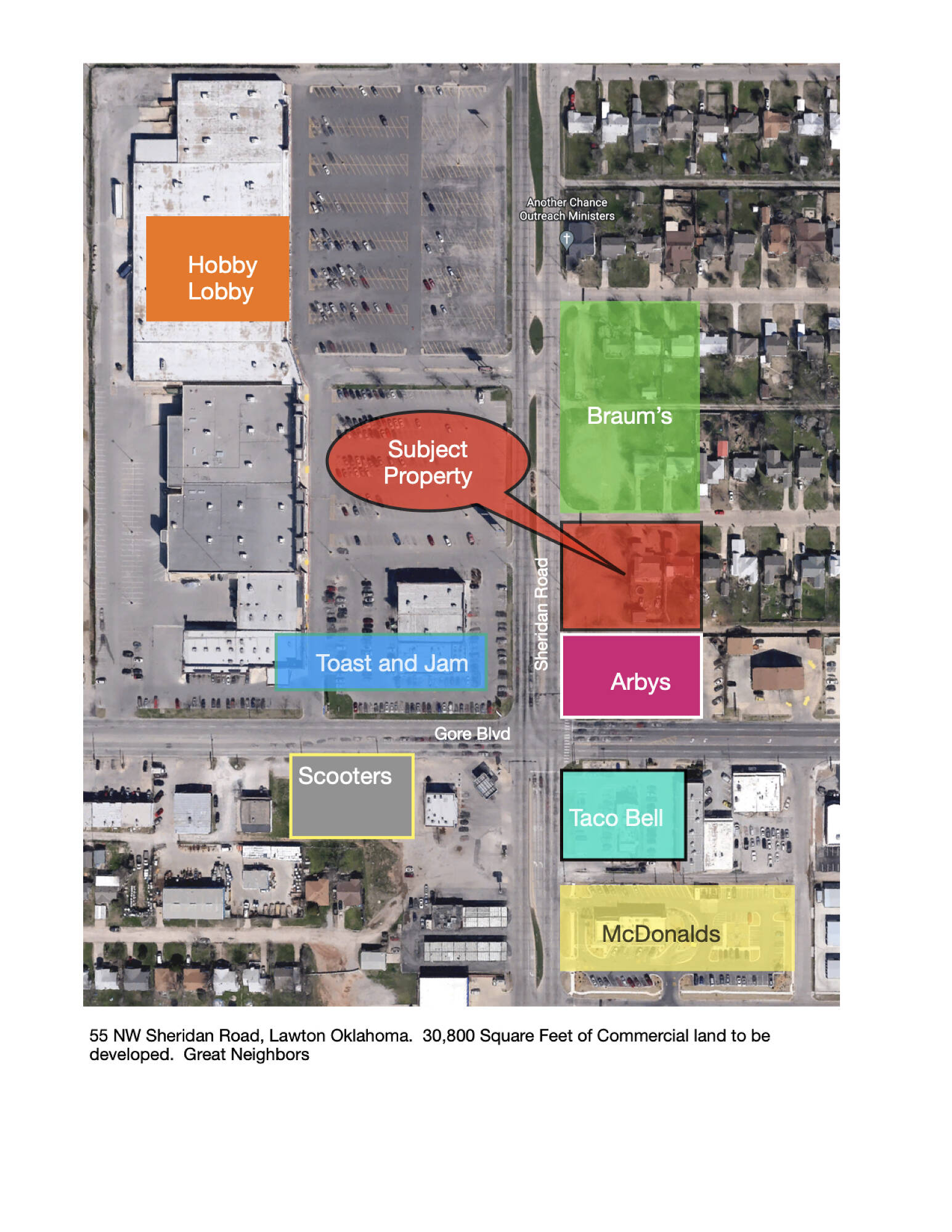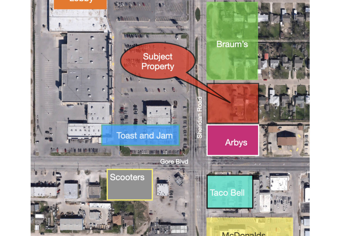 This property is located in Lawton Oklahoma. Lawton is the home of Fort Sill Military Post. It is located near the intersection of NW Sheridan Road and W Gore Blvd. There are high traffic counts in this area. Arby’s restaurant is immediately south neighbor and a new Braum’s restaurant and store is to the north. This would be a great location for drive through location for many types of business..